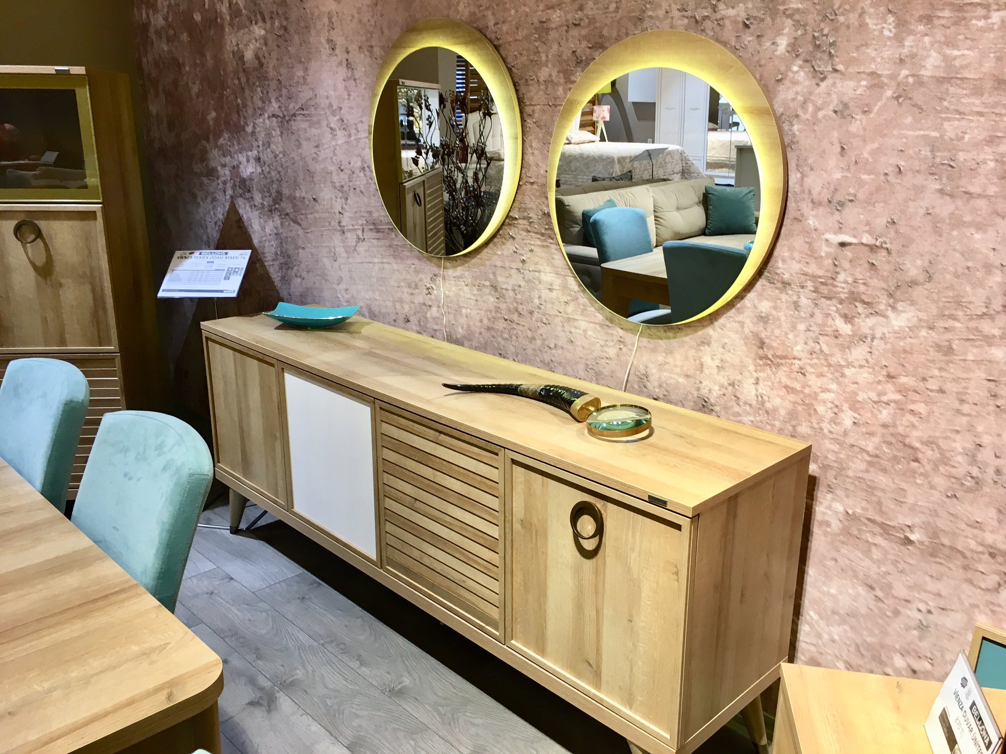 Vienza yemek odası takımı. Tarzının yanı sıra sunduğu kullanım kolaylıklarıyla da göz dolduran takım asılabilir aynaları ve aydınlatma sistemiyle de destekleniyor.